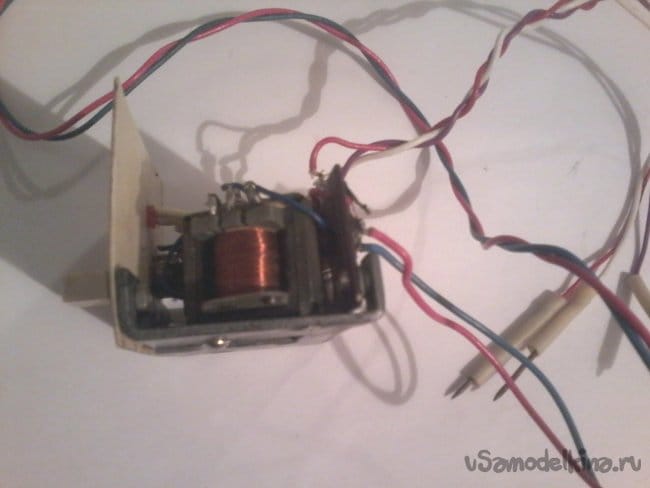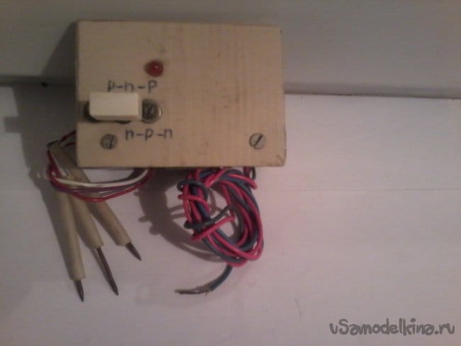 Спаиваем всю схему, проверяем правильность сборки. Из медного провода диаметром 1 мм я изготовил 3 щупа, заострил их концы напильником. Припаял к щупам провода, и подключил к прибору «белый» -к клемме 1 «база»; красный - к клемме 2 «коллектор», фиолетовый к клемме 3 - «эмиттер». Питание на прибор подаю от блока питания синим – минус, и красным –Плюс 4,5 в . Переключателем SA 1 выбираем структуру транзистора « P-N–P» или N–P-N»