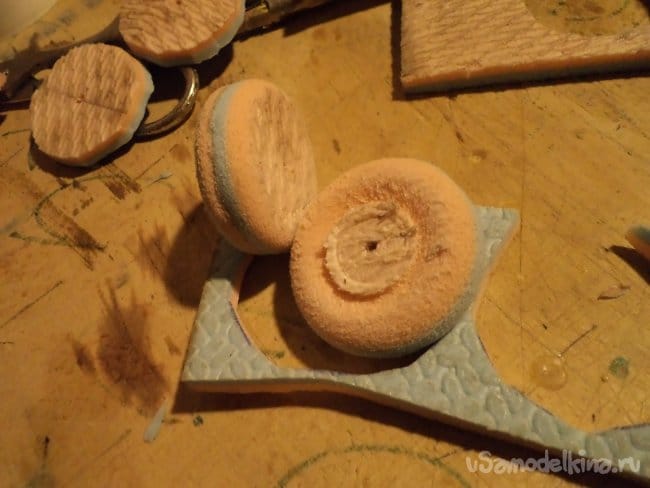 Из старого гимнастического коврика вырезал круги по размеру требуемых колес, склеил их попарно клеем «Момент» универсальный, кристалл.