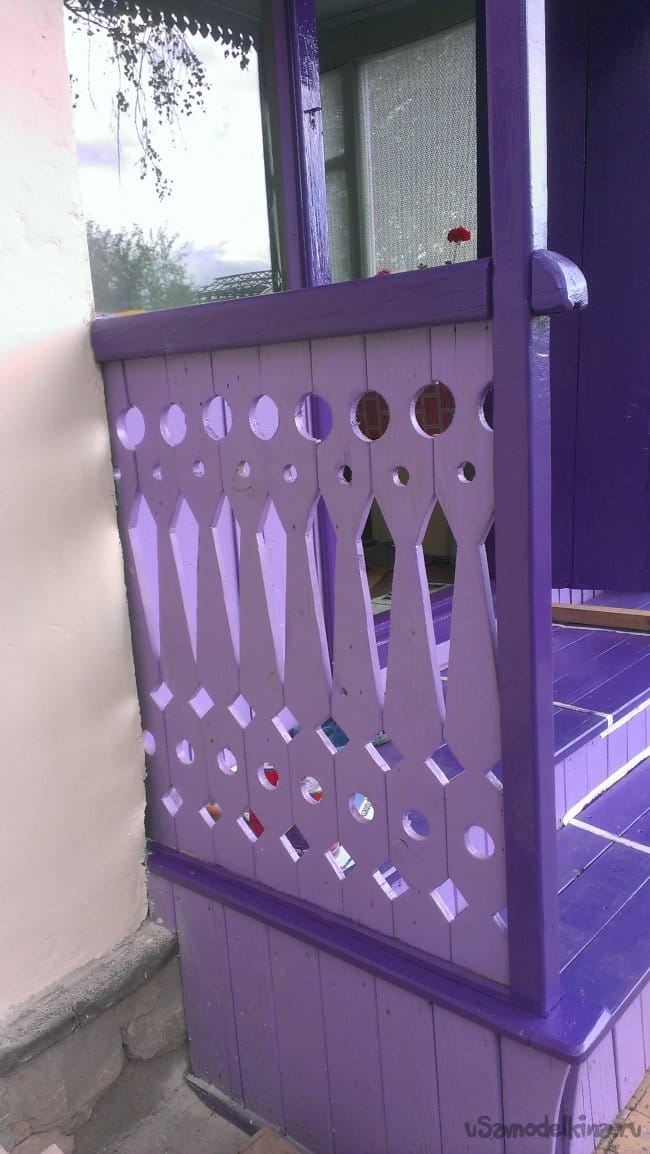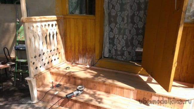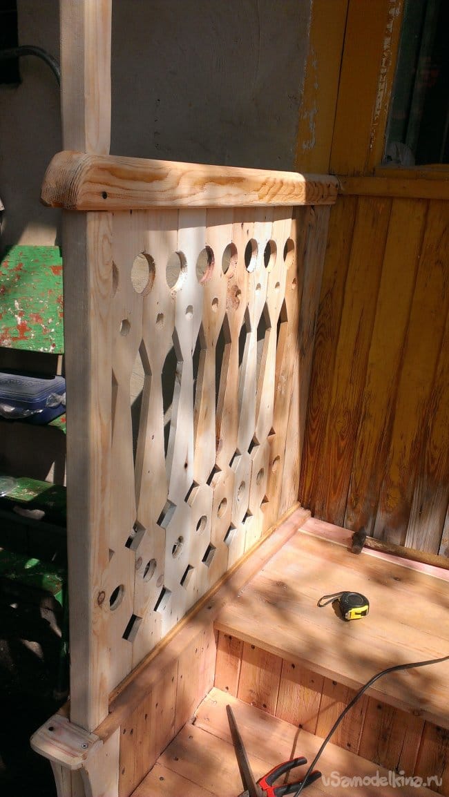 На ступеньках с правой стороны, по краю, был предусмотрен скос. Проступни, были зашиты вертикальными досками. Стойки крыши крыльца, через стропила связаны со стеной веранды и жестко зафиксированы. По мимо этого жесткость еще придают резные перила, выполненные из досок снятых с поддонов. Рисунок выпилен электро лобзиком.
