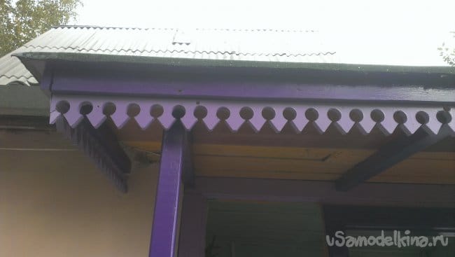 Вся веранда была очищена от старой облупившейся краски. Помощник приступил к покраске почти готового крыльца. А, я занялся выполнением резьбы под срез крыши.