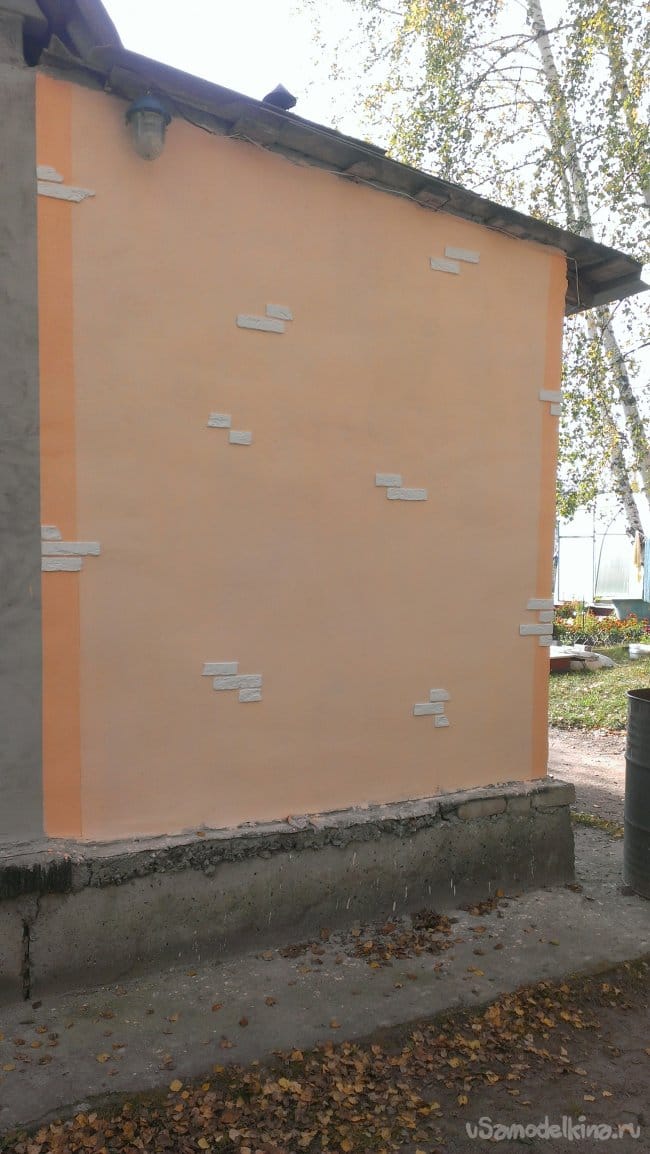 Полюбовавшись своей работой, мы с помощником поняли, что обшарпанный фасад бани, примыкающей к веранде и дому портит все.
