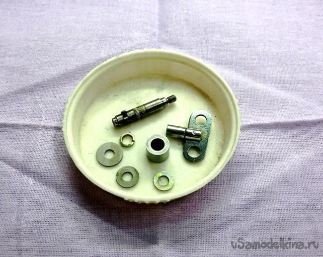 Устанавливаем ось в основание опоры. При сборке, на ось устанавливаем ролик опоры и шайбу для регулировки зазора (при необходимости). Вначале выполняем неполную сборку-примерку с контролем и регулировкой зазоров. Затем собираем окончательно. Желательно беззазорное соединение оси с основанием опоры, за счет точного посадочного отверстия или соединения с небольшим натягом. Фиксируем ось гайкой и разрезной пружинной шайбой. Так как ось была часовой, то и гайкой оказалась заводная гайка-барашек от будильника. Удаляем пластину гайки (мало места) и получаем нужную гайку со шлицом.