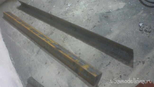 Станину я решил сварить из стальных уголков 50 на 50. Для этого я отрезал два куска, длиной один метр. (размеры прикинул, исходя из того, чтобы позже была возможность обрабатывать деталь длинной полметра. (Например, если захочу выточить ножку табурета)))