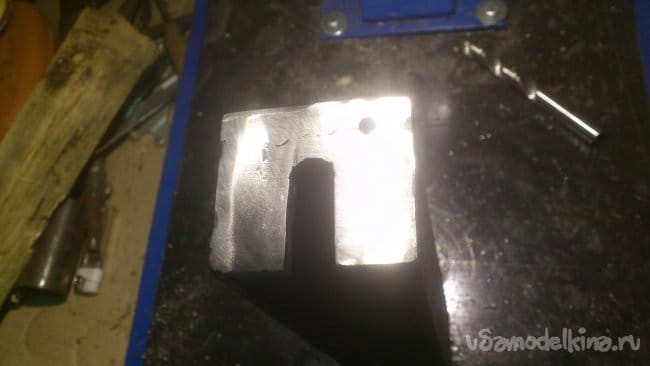 Так как он должен легко, без запинок, двигаться под станиной, в пространстве, ограниченном боковыми полками несущих уголков, я постарался как можно более сгладить все неровности и закруглить углы. ( В идеале её надо бы сделать круглой... Но размер подошёл, и резать много не хотелось))) ). В центре просверлил отверстие под болт поводка: