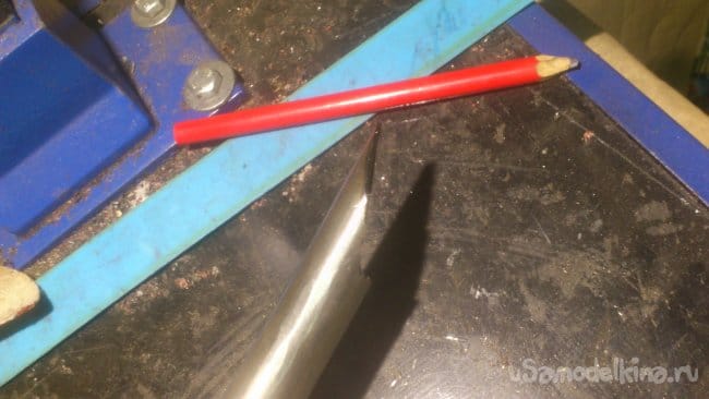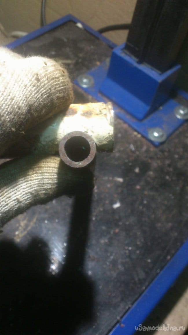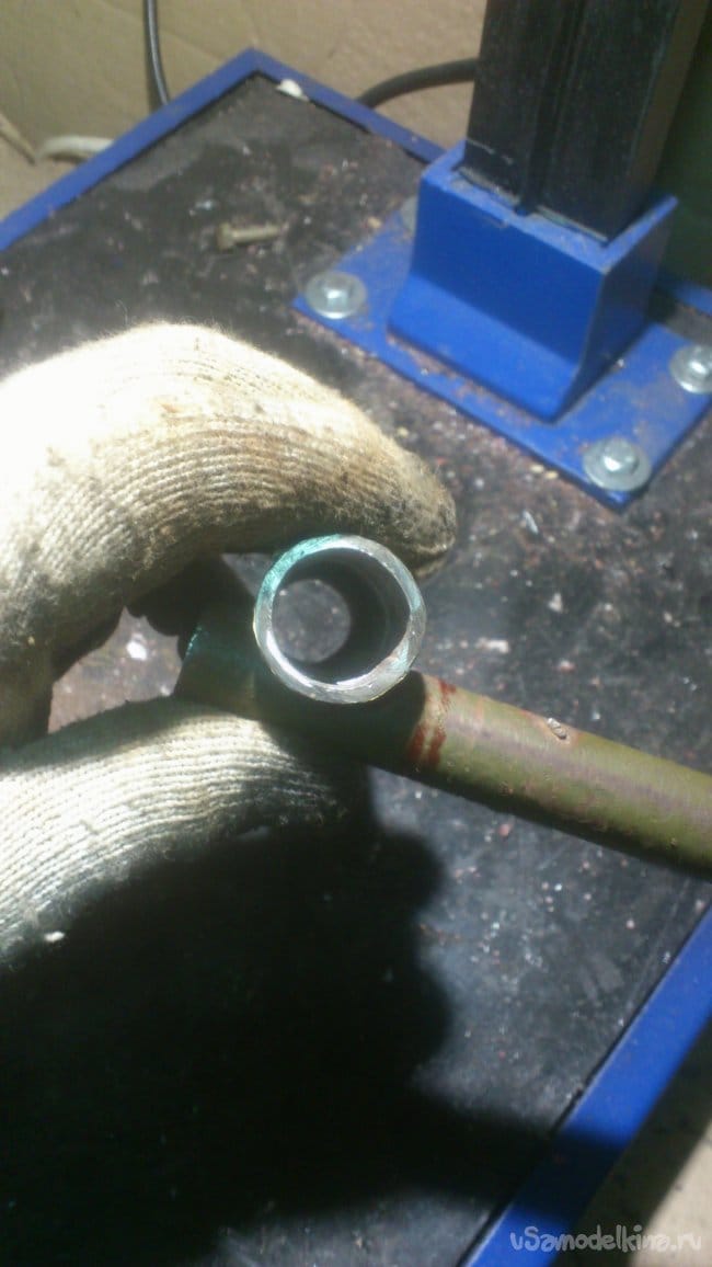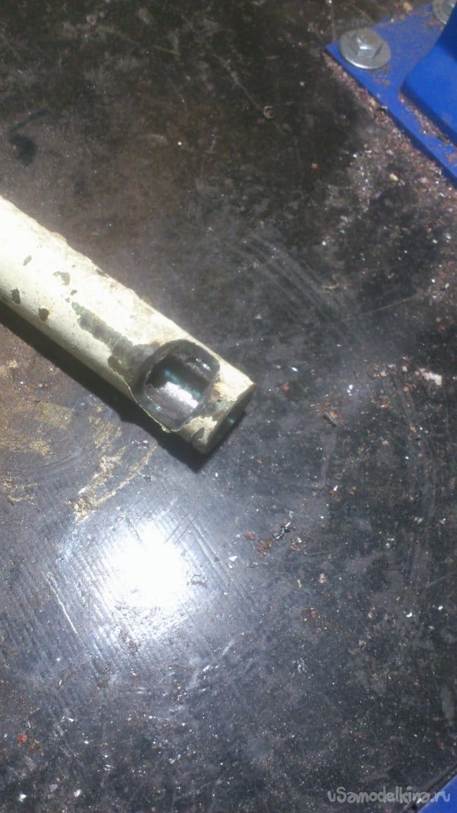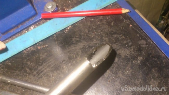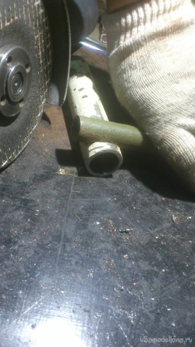 После чего я сделал ему "ногу" из трубы ДУ-15. Для того, чтобы подручник располагался под наклоном к заготовке, я сделал на краю трубы вот такой вырез: