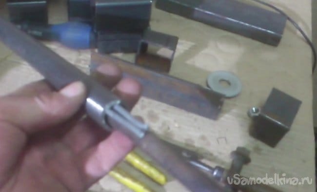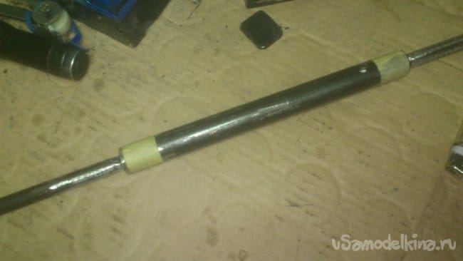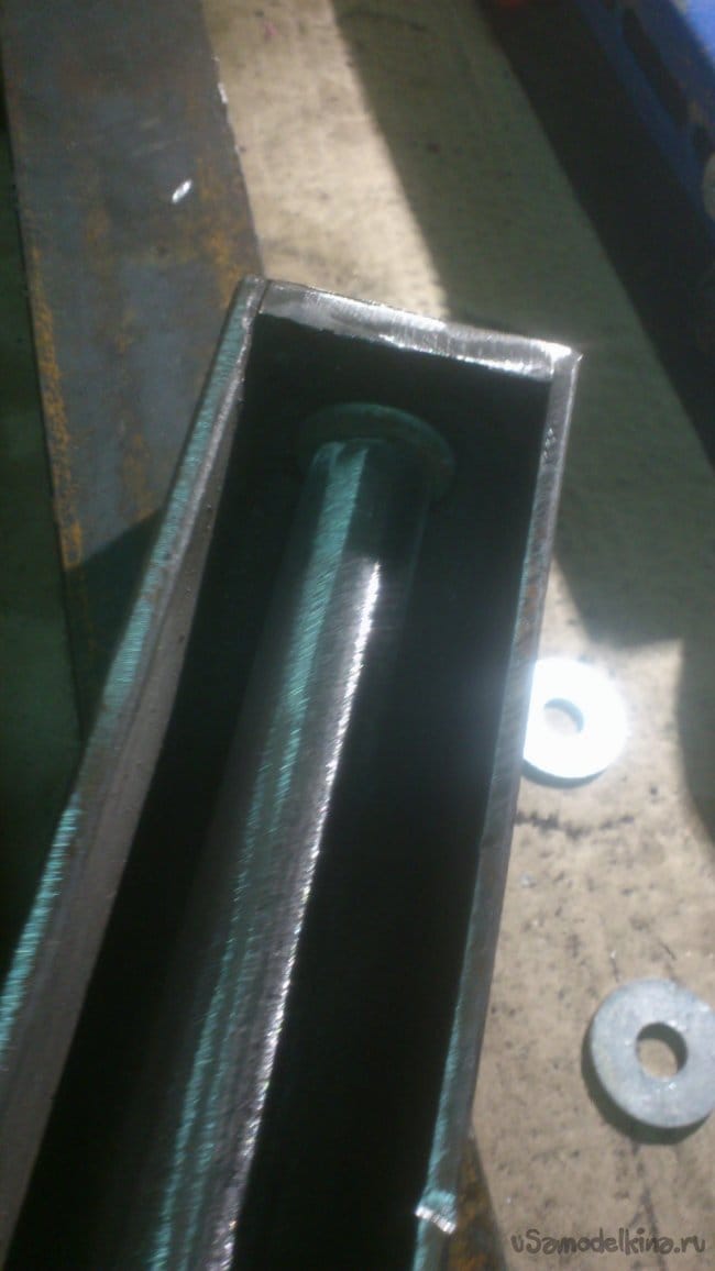 Теперь на вал одеваем шайбы(компенсировать люфты, которые появились, когда я зачищал болгаркой торцы), одеваем на него поводок и вставляем внутрь короба: