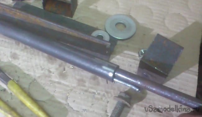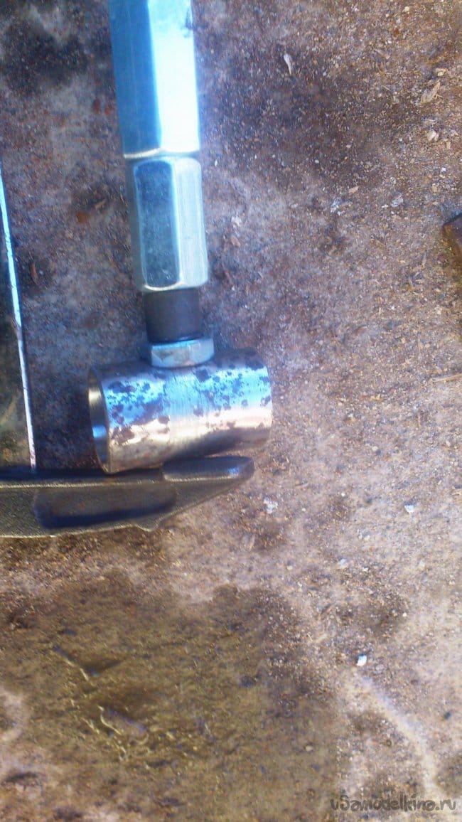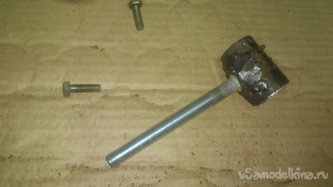 Теперь нужно изготовить поводок. Для этого я использовал болт М12 и обрезок водопроводной трубы Ду-20. После того, как внутри был убран сварочный шов, она легко стала одеваться на мой вал. Болт я приварил к трубе прижав его к ней шляпкой, не забыв в процессе сварки защитить резьбу: