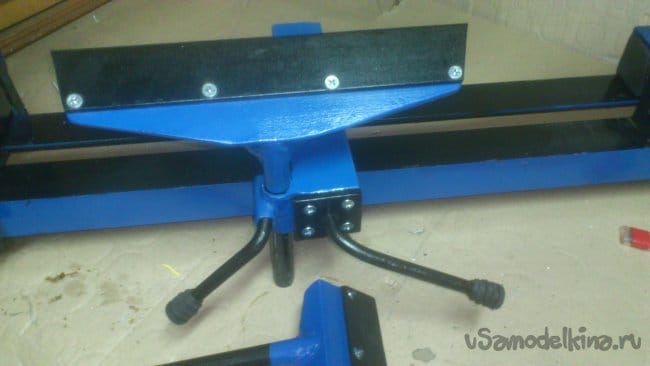 . Если вставить вал в поперечную трубку, то выборка не помешает вставить "ногу" подручника. Вставив на нужную глубину и выставив его как требется относительно оси заготовки, зажимаем его, поворачивая рычаг вниз.