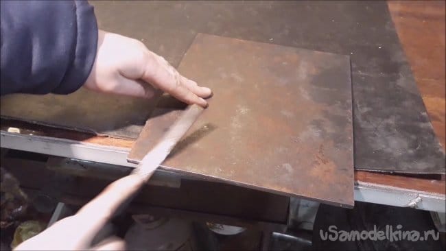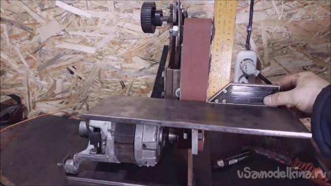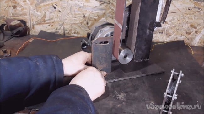 Столик для работы вырезан из листа 10мм. Размер около 150 на 300мм. К снованию приварен кронштейн с отверстием и добавлена косынка. Такая же пластина приварена к столику. Отверстие выполнено в форме прорези. Это позволяет производить регулировку столика. Его можно двигать ближе или дальше относительно ленты, а так же менять угол наклона. Это удобно при заточке различного инструмента. В процессе сборки столик выставлен перпендикулярно боковой стороне ленты.