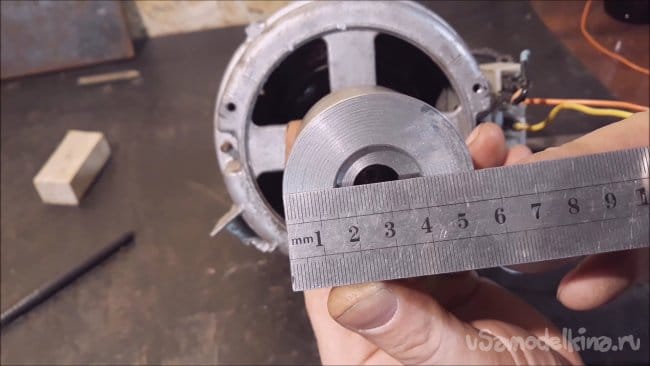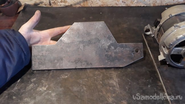 Приступим. Для основания был взят лист железа толщиной 7 мм. Размер пластины получился 250 на 300 мм. Из этого же куска вырезаем вертикальную стойку и привариваем как на картинке. Так же не забываем про косынку для придания жёсткости. Здесь особых размеров нет, так как всё делалось под конкретный двигатель. Вы тоже ориентируйтесь на то, что у Вас есть. А общую компоновку думаю поймёте. Так же был заказан приводной ролик диаметром 55 мм. Он установлен на вал двигателя и законтрён болтом м6.