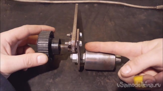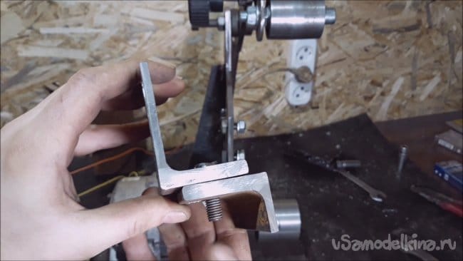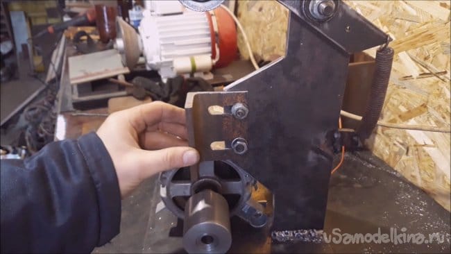 При вкручивании болта пластина с роликом отгибается в одну сторону, а при выкручивании в другую. Этим и происходит регулировка ленты от смещения. Ну и сами ролики должны находится в одной плоскости. Так же верхний ролик выполнен в форме бочки. Это позволяет удерживать ленту при работе в одном положении. Этот узел крепится к вертикальной стоике болтом. Между пластинами стоит упорный подшипник от передней стойки автомобиля форд. Это соединение должно быть подвижно, но без люфтов. Оно служит для натяжения ленты. С обратной стороны натянута пружина.
