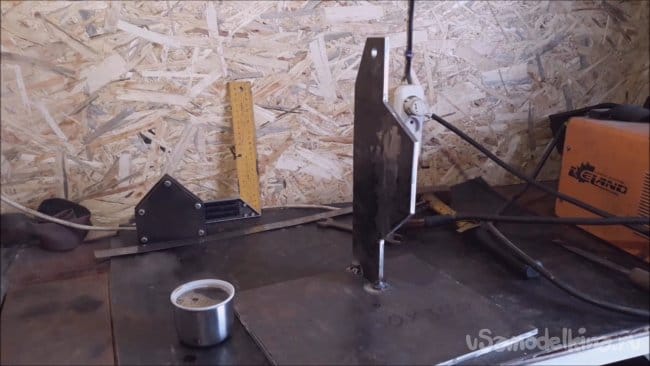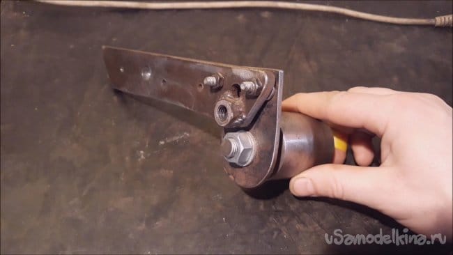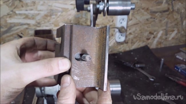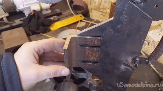 Теперь из разрезанного пополам швеллера изготовил кронштейн для прижимной площадки. В нём сделаны пазы для регулировки. К второму куску приварена сама прижимная площадка. Он прикручивается к первому обрезку на болтовое соединение для возможности отрегулировать положение площадки.