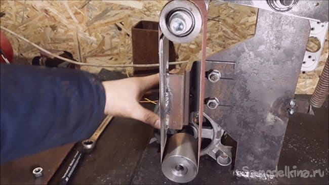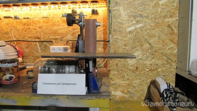 Вот такой станочек помощник появился у меня в гараже. Наждаком перестал пользоваться вообще. Здесь можно поставить ленту разной зернистости. Хорошо подходит ля заточки инструмента и сверл. А так же на нем отлично выводить спуски на ножах.