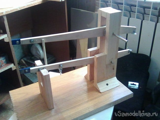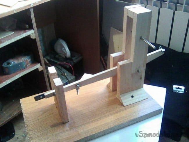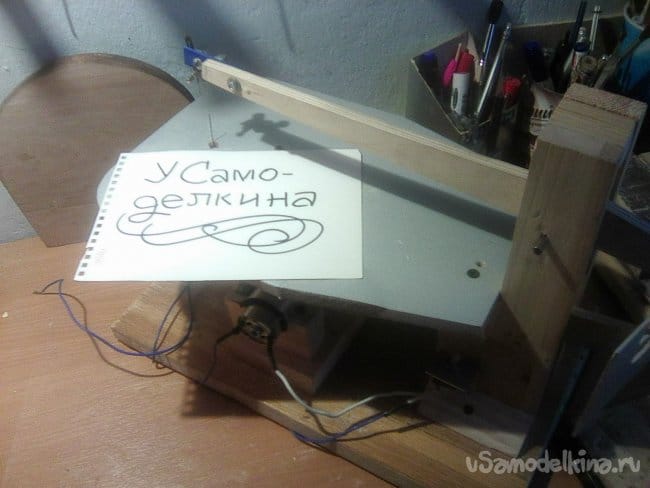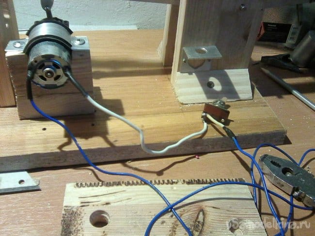На задний конец коромысел приспособил резиновую нить , которой пользуются рыбаки. В перспективе подобрать подходящую пружину. Электропроводка простая- тумблер, источник питания автомобильное зарядное устройство. В процессе испытания выявились некоторые недостатки: большие обороты двигателя -подключил сопротивление ; вибрация двигателя – уложил резиновую подкладку под двигатель, усилил крепление к основанию. Пилки использовал спиральные 1 мм, очень удобные. Вот пожалуй и все. Приглашаю посмотреть видео.