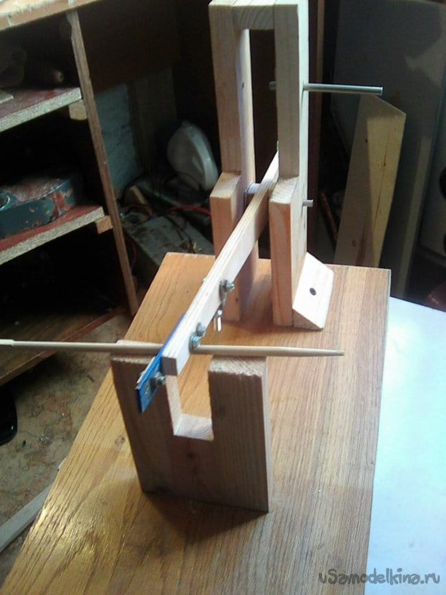 Коромысла посадил на ось из металлических стержней D-4 мм. Долго искал электропривод. Все имеющиеся двигатели слишком оборотистые, сильная вибрация. Надо ставить редуктор.