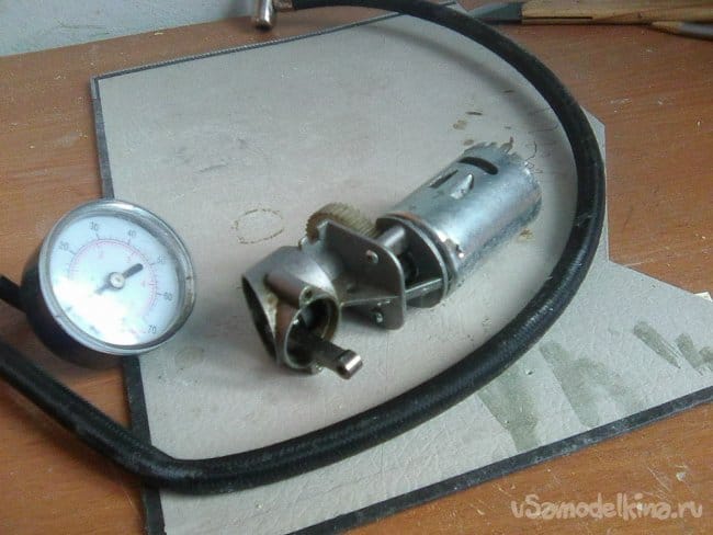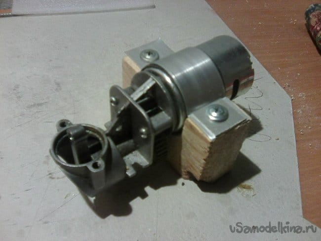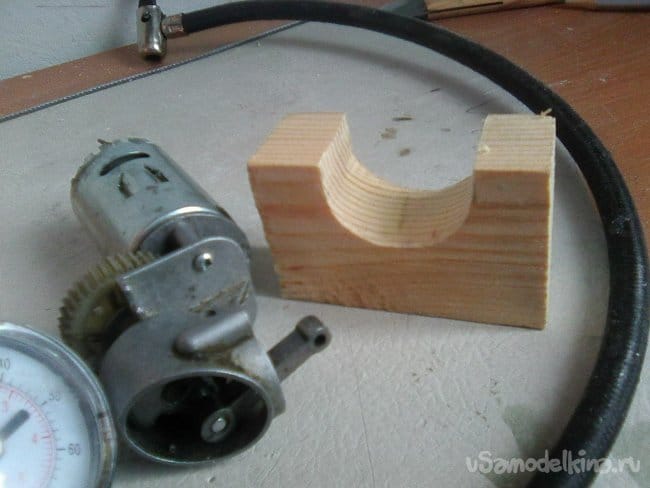 Под рукой оказался электропривод автомобильного насоса для подкачки шин на 12 вольт. Потребовалась небольшая переделка, пришлось убрать поршень. Двигатель врезал в деревянную подставку, подобрал нужную высоту от основания изделия, изготовил узел соединения с нижним коромыслом.