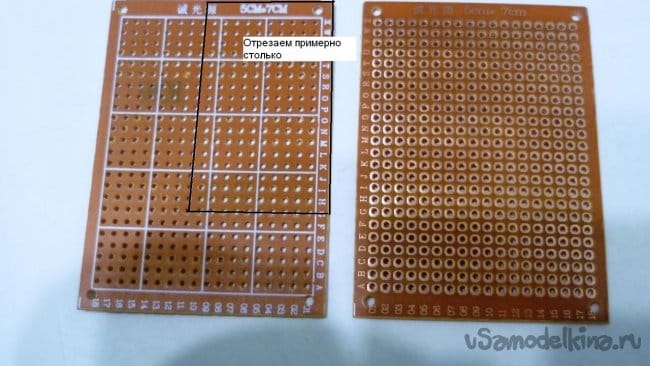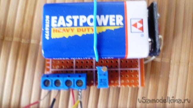 От макетной платы отрежем кусок нужного размера, чтобы разместилась батарейка, клемник и подстроечный резистор. Можно сделать и печатную плату или произвольно распаять схему на любом диэлектрическом материале.
