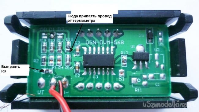 Припаиваем выход температуры из приставки на LM35 к процессору (в точку указанной в фото). Заклеиваем горящюю точку на вольтметре черной изолентой, после второй цифры вольтметра наклеиваем белую точку.