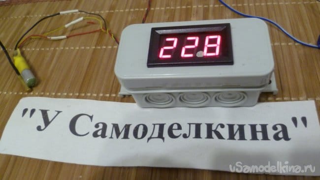 Последним шагом изготовления самоделки будет размещение в подходящем корпусе. Нашел небольшую распредкоробку – в нее как раз уместилась и платка и вольтметр. Наружу выходят провода датчика и питания. Можно запитать схему и от аккумулятора и разместить его в корпусе, тогда прибор будет полностью автономен.