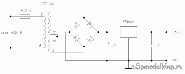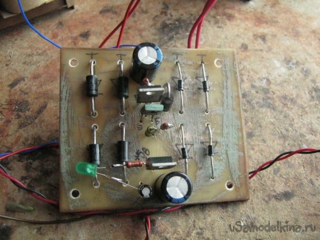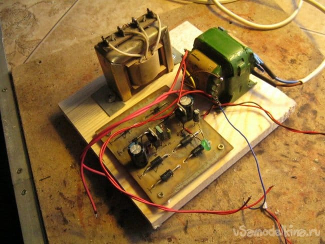 Со стабилизированным выходным напряжением (значительные колебания в сети). Стабилизатор собран на основе микросхемы КР142ЕН5А и особенностей не имеет.