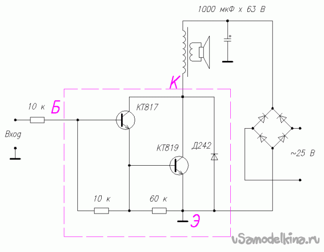 Простейший однотактный трансформаторный. Собран на двух (одном составном) транзисторах. Усилитель имеет собственный выпрямитель не связанный с питанием цифровой части устройства.