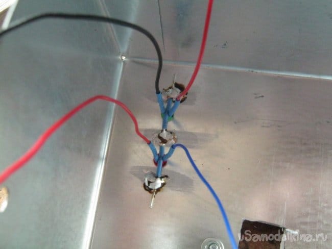 Два светодиода для индикации питания закреплены в отверстиях на кожухе устройства изнутри, толстой луженной медной проволокой пропущенной между ножками светодиодов и припаянной по краям к кожуху.