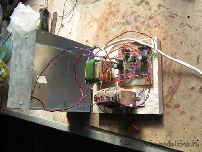 На кусочке тонкой строганной сосновой дощечки четырьмя тонкими шурупами закреплена плата. В качестве стоек применены по два квадратика линолеума подложенных под каждый шуруп. Стандартный трансформатор питания закреплен четырьмя винтами М3 пропущенными сквозь основание, трансформатор согласующий имел четыре лепестка для установки «перекручиванием» в тонком металлическом основании. Надежное его крепление удалось сделать из двух кусочков тонкого металла с отверстиями для шурупов. Ими прижимались к деревянному основанию отогнутые лепестки обоймы трансформатора.