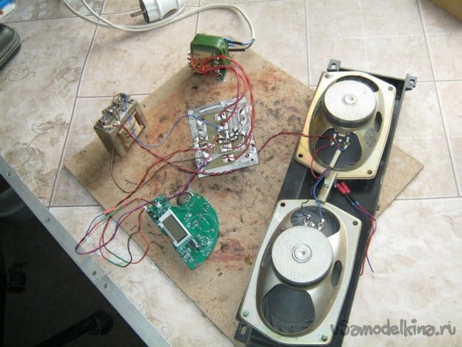 Стоит сказать, что схема усилителя не вполне оптимальна в данном применении – первоначально она предназначалась для работы на пьезоизлучатель (согласующий трансформатор был включен наоборот), но достаточно высокой громкости таким образом достичь не удалось и опыты продолжились с динамическими головками. В проектировании УМЗЧ «с нуля» лучше применить двухтактный усилитель или УМЗЧ на недорогой специализированной микросхеме мощностью в несколько ватт.