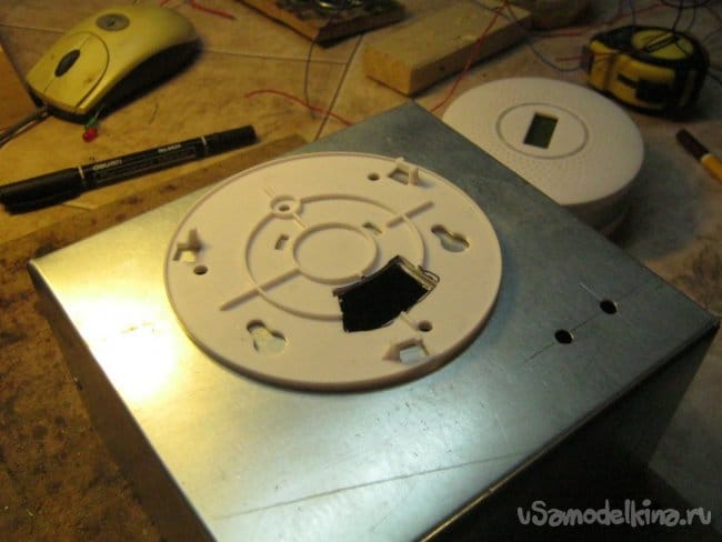Тремя короткими винтиками с полным джентльменским набором (шайба-гайка-гровер) была закреплена на жестяном кожухе пластиковая съемная подошва пожарной сигнализации. Лобзиком по дереву, предварительно в ней был пропилен проем для соединительных проводов, небольшой УШМ аналогичное отверстие было сделано на жести.