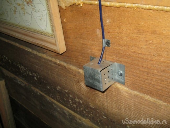 На фото выше стрелочкой показан вынесенный датчик СО. Для испытаний. Ниже – он же в защитном жестяном кожухе на стене. Провод закреплен на деревянной стене в нескольких местах жестяными хомутиками. Длина «разнесения» около 1 метра.