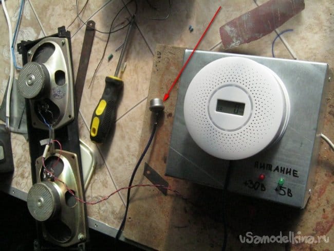 Где: 1 – фабричная пожарная сигнализация; 2 – вынесенный датчик СО; 3 – блок питания +5 В; 4 – усилитель НЧ нагруженный на динамическую головку 5, вынесенную за пределы мастерской 6.