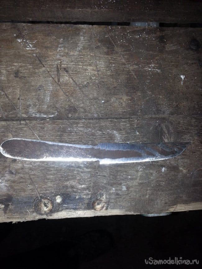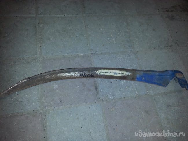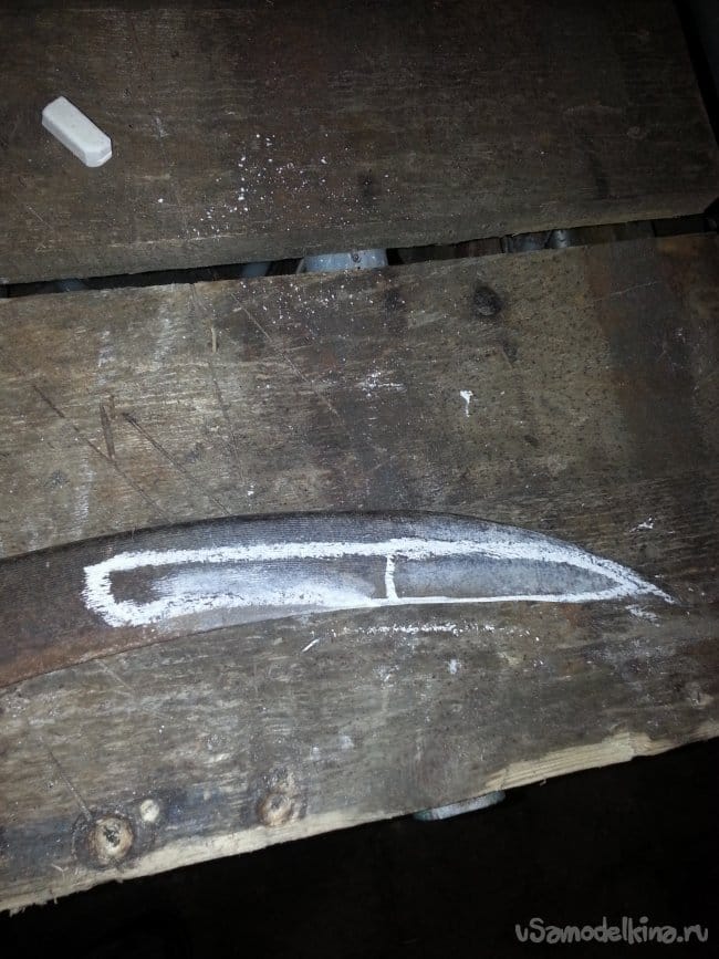 Итак рисуем на нашей косе мелом очертания будущего ножа, рисуем на кончике острия так как там самое прочное место.