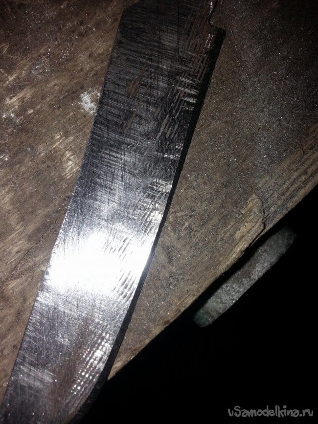 Следующий этап этой же бумагой мы заостряем лезвие. У меня для заточки ножей есть китайская точилка, она поправляет очень даже хорошо. После неё я аккуратно наждачкой шлифую, а то она оставляет заусенцы. Нож получился острым как бритва