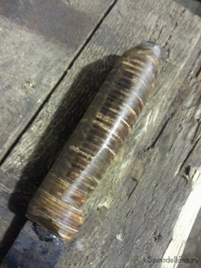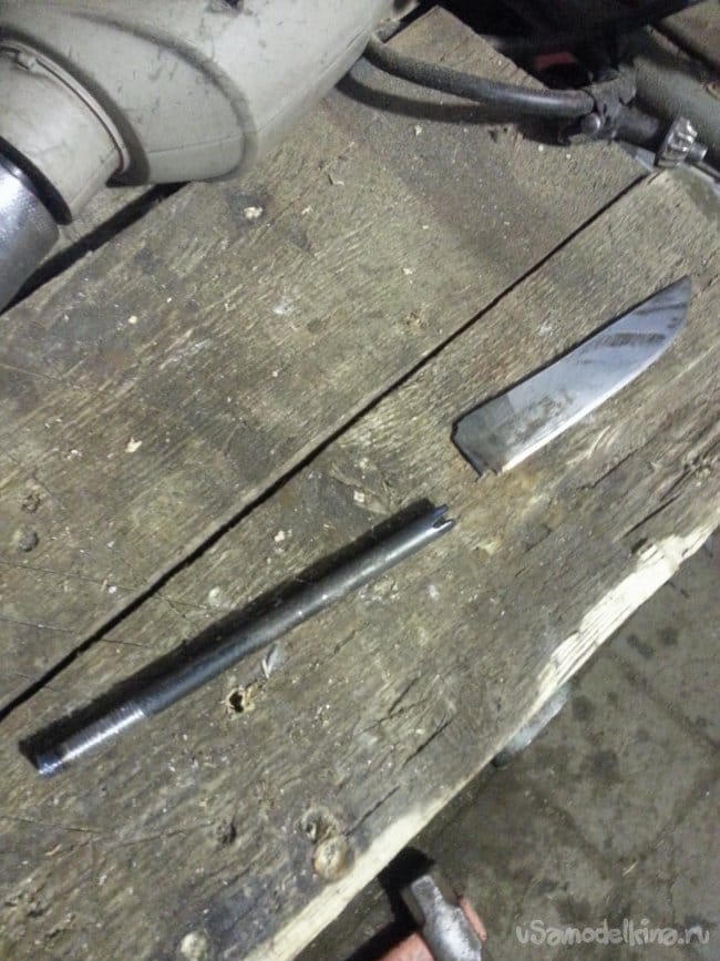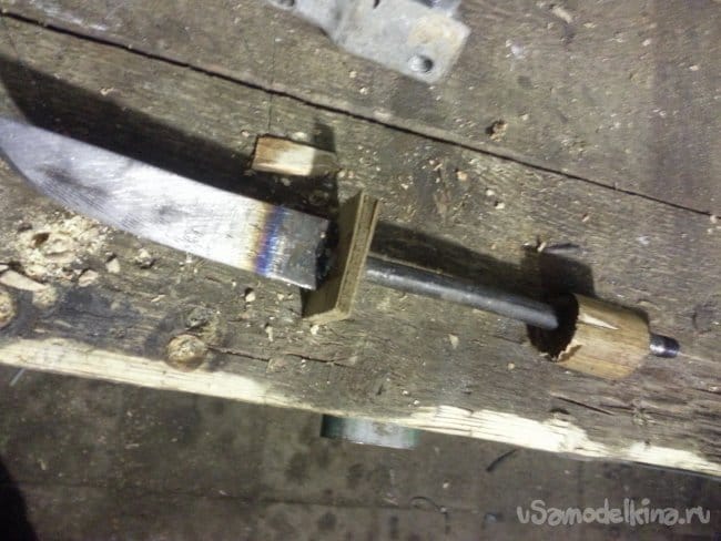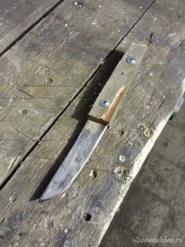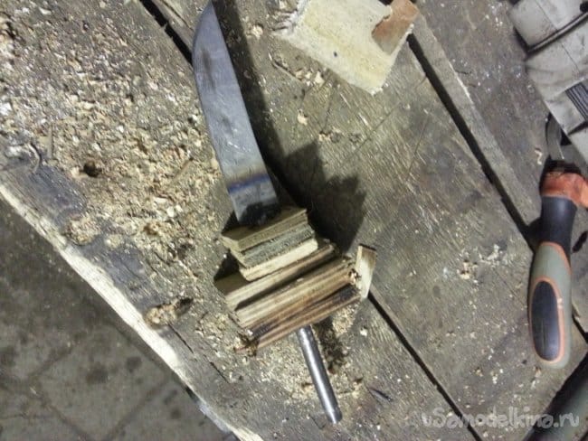 Далее я решил пойти другим путем. Я решил сделать ручку наборной из этой же фанеры. И так я все разобрал и отрезал ручку затем из проволоки 8мм я сделал шпильку, а в во втором краю, вдоль 1см, я сделал распил