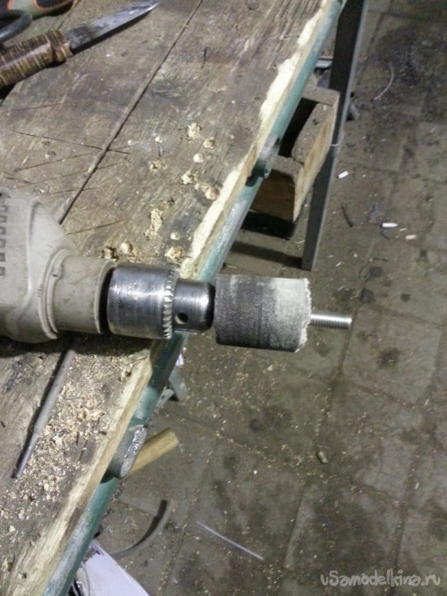 Далее я сделал насадку на дрель и шлифовал долго убирая горелую древесину