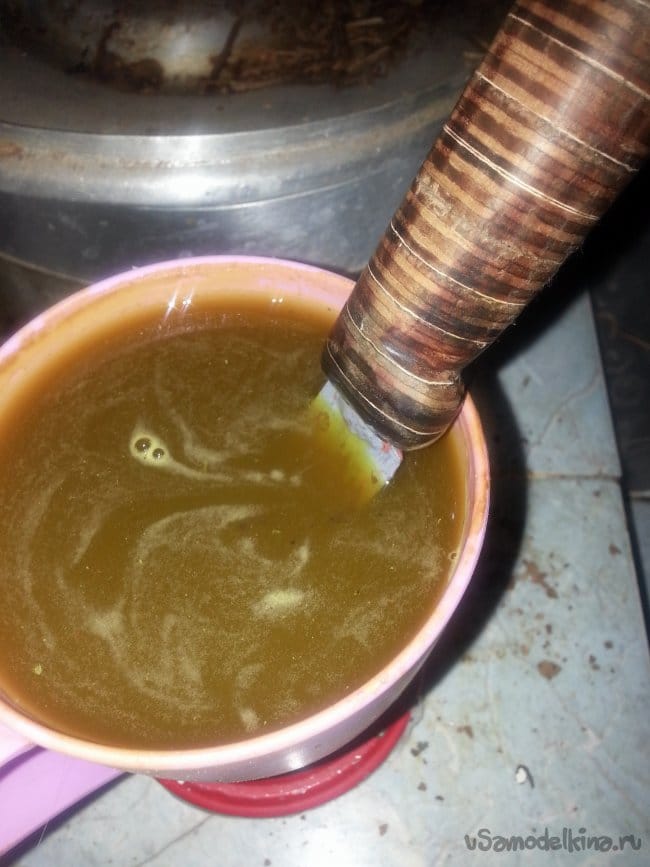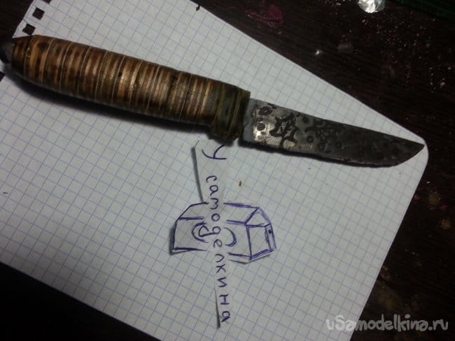 Вот, как-то так, местами пришлось руками шлифовать наждачкой. По приходу домой я натёр ручку натуральным воском и войлочным кусочком натёр до блеска ручку. Далее на лезвие ножа, после обезжиривателя, нанес лак для ногтей и после высыхания нанес рисунок иглой. Потом развел один к десяти хлористое железо для травки плат и метала, и добавил оставшийся раствор после травки печатной платы, погрузил на сутки в раствор. Периодически, где то раз в час, протирал ватным диском метал для лучшего травления рисунка