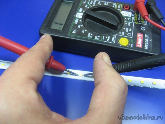 Чтоб выяснить какие светодиоды перегорели, можно применить самый простой мультиметр. Нужен предел измерения диодов, у меня он совмещен с пределом на 2000 Ом. Касаемся щупами на выводы светодиода. Определить полярность, можно сменой щупов между собой.