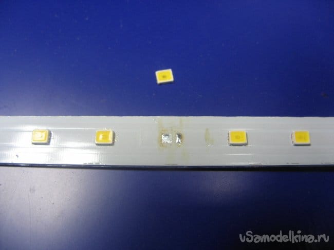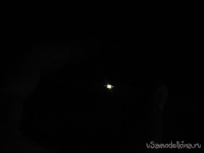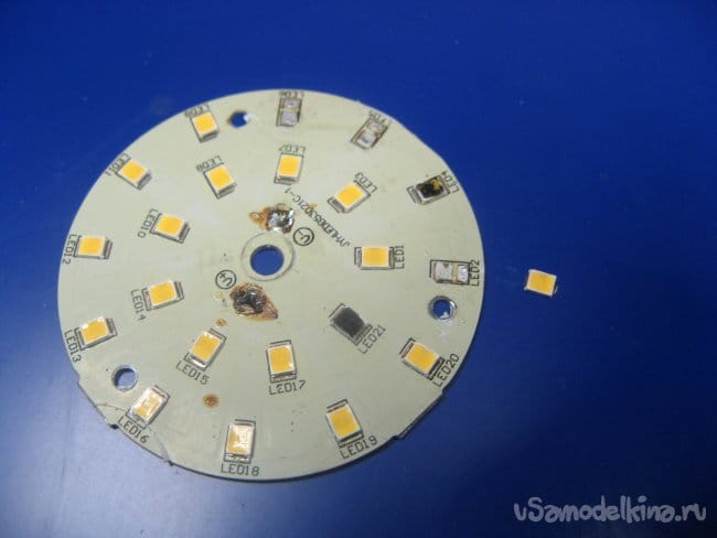 Для ремонта я применил светодиод с донора. Донором у меня служит сгоревшая лампа. Там такие же светодиоды. На всякий случай, проверяем полярность. Можно купить в Китае, но нужно долго ждать. Отпаиваем светодиод.