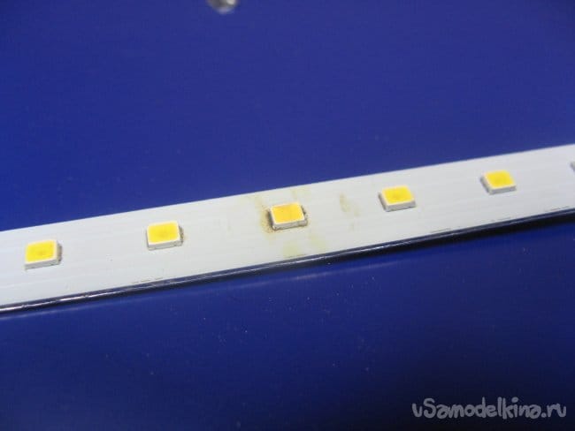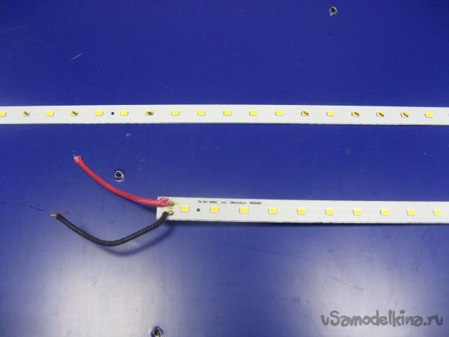 Принесли мне линейки на 44 светодиода. На линейке 4 отрезка по 11 последовательно соединенных светодиодов. Отрезки соединены между собой параллельно.