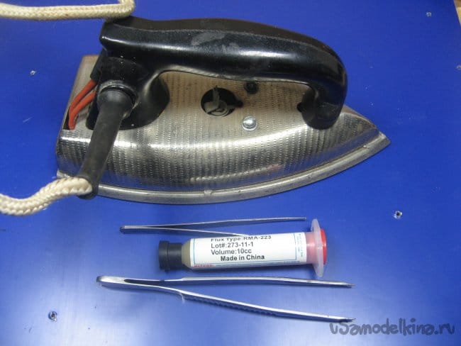 Пару слов о специальном паяльнике. Паять буду обычным бытовым утюгом. У меня это старичок советского времени. Так же я им делаю платы по технологии ЛУТ. Так же понадобится два пинцета. Для удобства пайки нужен флюс RMA-223, китайская версия. Можно применить обычную спитро-канифоль. От нее больше грязи.