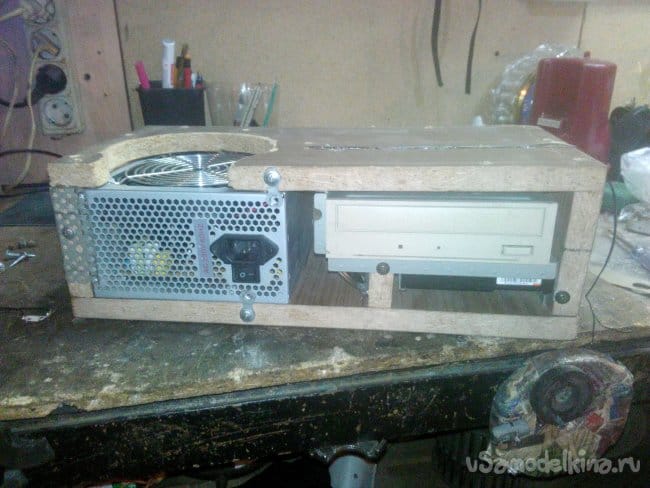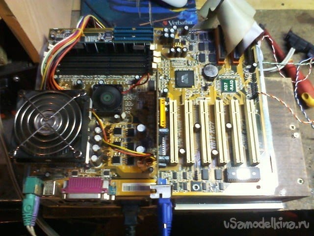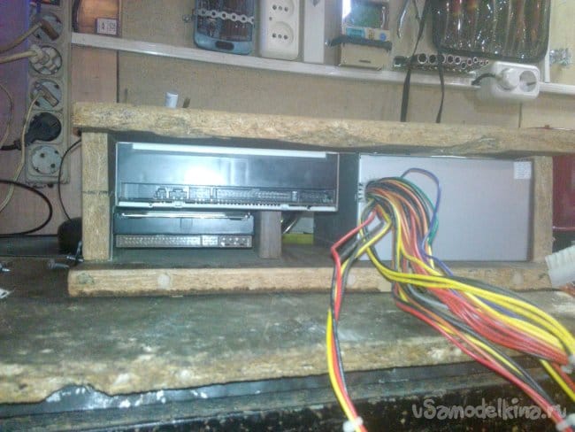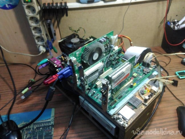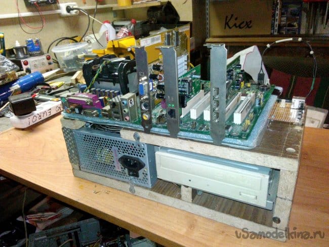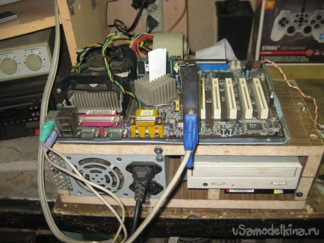 Многим самоделка не понравится, потому что мало применима, но делал для себя, и очень ей доволен, за исключением её внешнего вида)))) Главное практичность а не красота. У многих обзорщиков компьютеров стендом служит какая нибудь коробка из под материнки, всё болтается, плата в любой момент может съехать. И это в домашних то условиях. А в гараже, под материнку запросто может закатится болт или отвёртка и позамыкать там все дорожки. А тут сам стенд довольно тяжёлый, т.к. в нём и блок питания и жёсткий с двдприводом. Ничего никуда не улетает, материнская плата прикручена к шасси. Надеюсь кому нибудь эта самоделка всё же пригодится тоже, и облегчит его работу. В плане внешнего вида надеюсь у вас получится поаккуратнее. Пишите в комментах своё мнение по поводу такого стенда для материнских плат. Я кстати даже никогда и не искал стенды в продаже, может быть есть какие то заводские готовые.