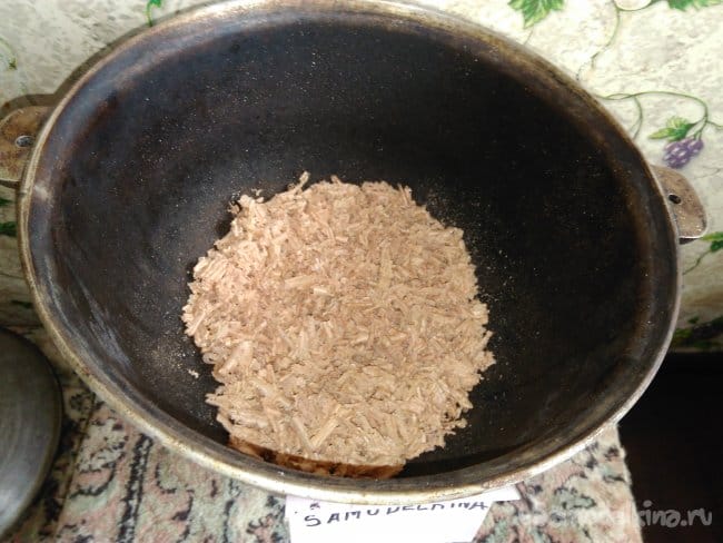 В казанчик засыпаем щепу, стружку или даже опилки, но только желательно фруктовых пород. Я использовал даже сосновые иголки, тоже получается не плохо.