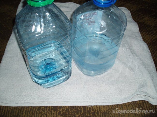 Для сравнения, снова две баклажки – справа с очищенной заморозкой водой и слева, не открытая, из магазина. От фотовспышки блестят одинаково. На вкус, конечно, разница есть. Но не такая, как по сравнению с водопроводной водой, даже и отстоявшейся.