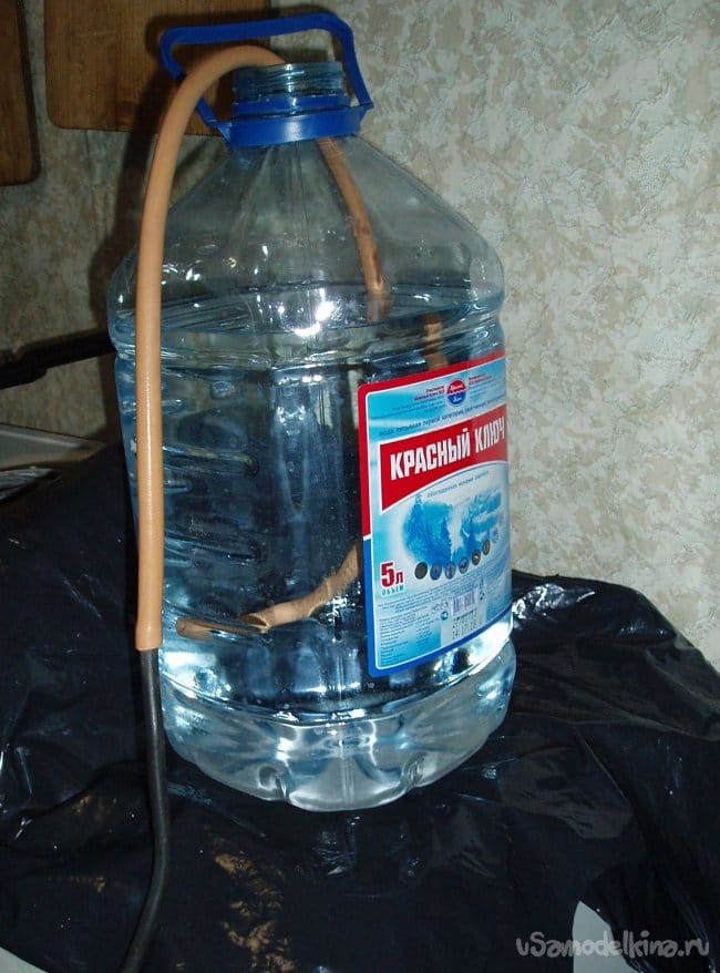 Теперь осторожно, не взбалтывая воду, ставим баклажку с талой водой повыше и с помощью трубочки (сифона) выкачиваем две трети верхней части воды.