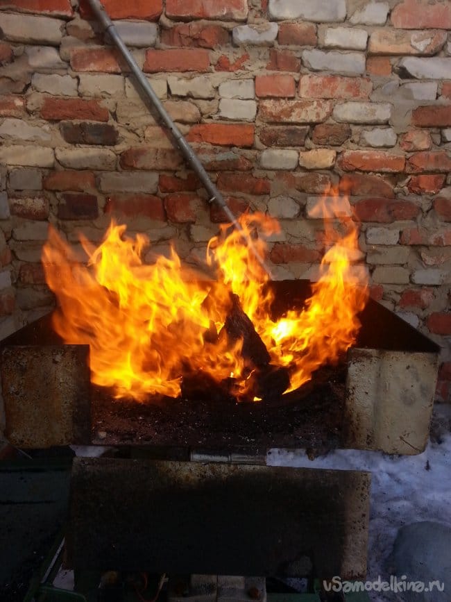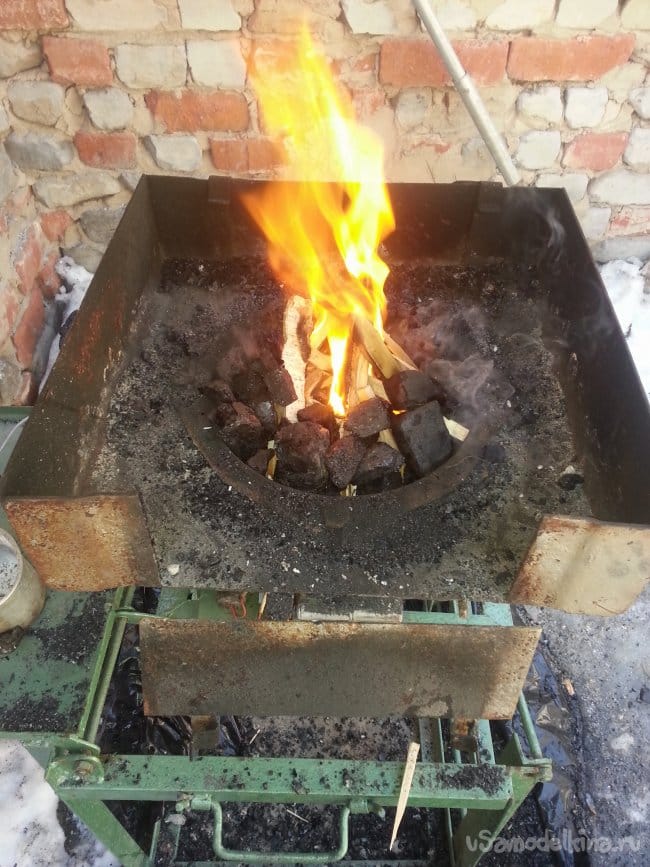 Теперь разжигаю свой горн. Он у меня маленький, да удаленький, как то положил в него лом хотел нагреть и выровнять остриё и пока сидел курил он нагревался и когда я решил проковать лом я его достал, а он сплавился