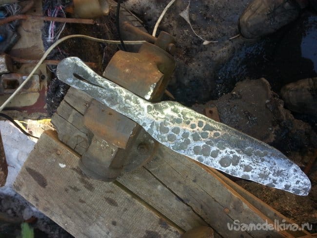 Теперь формирую кончик лезвия предавая окончательный вид. Далее пробиваю всю площадь металлическим шариком не сильно так лезвие станет прочнее