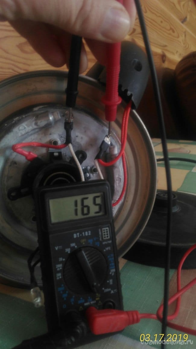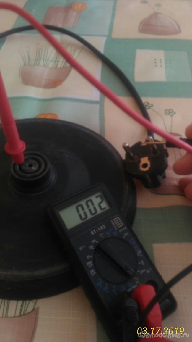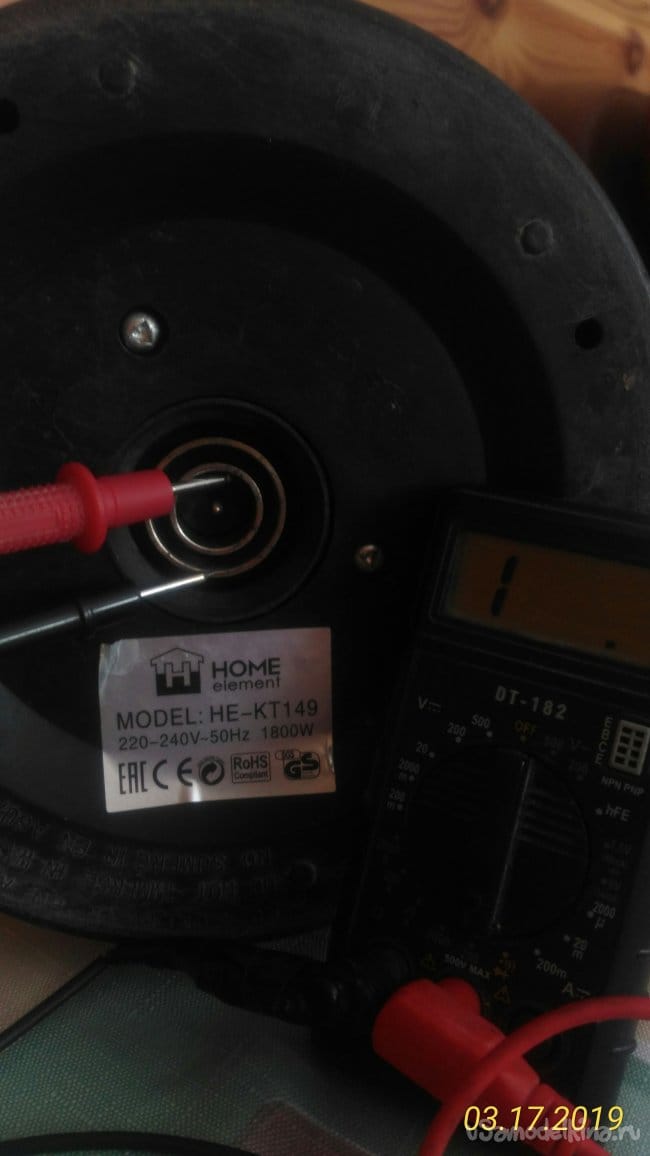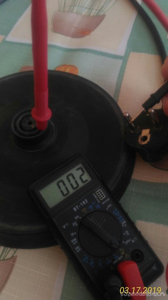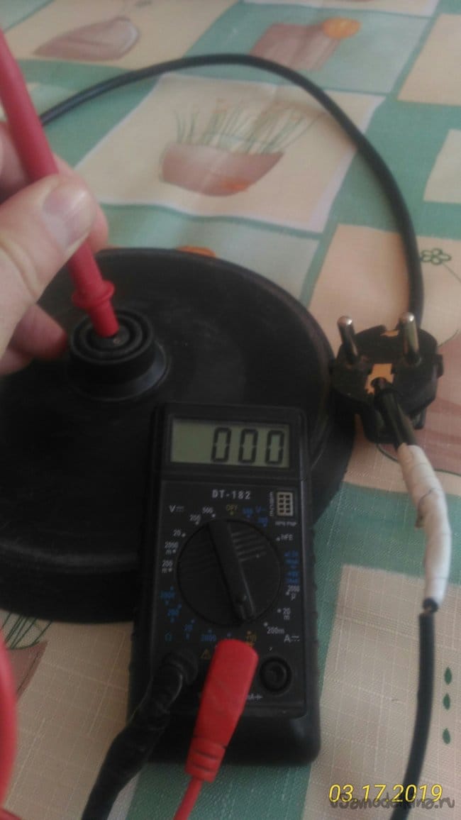 Сначала, не разбирая чайника, при помощи тестера попробуем определить в каком состоянии находится электрическая цепь чайника. Судя по показаниям тестера становится понятно, что неисправность в самом чайнике.
