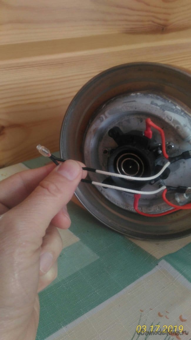 Эти показания индивидуальны и могут отличаться. Главное мы определили ТЭН исправен, продолжаем разбираться дальше. Теперь нам надо определить какой провод куда идет. Мы видим два провода белого цвета, которые подключены к неоновой лампе, которая показывает включен чайник или нет.