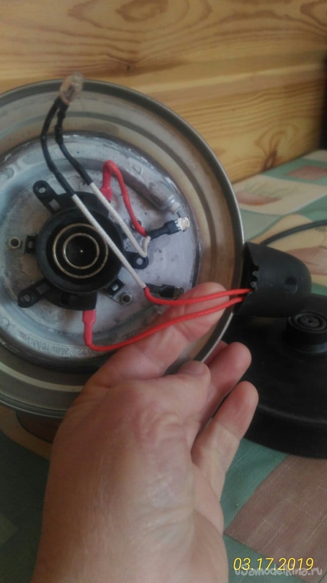 Один красный провод соединяет один контакт ТЭНа с электрическим гнездом чайника.