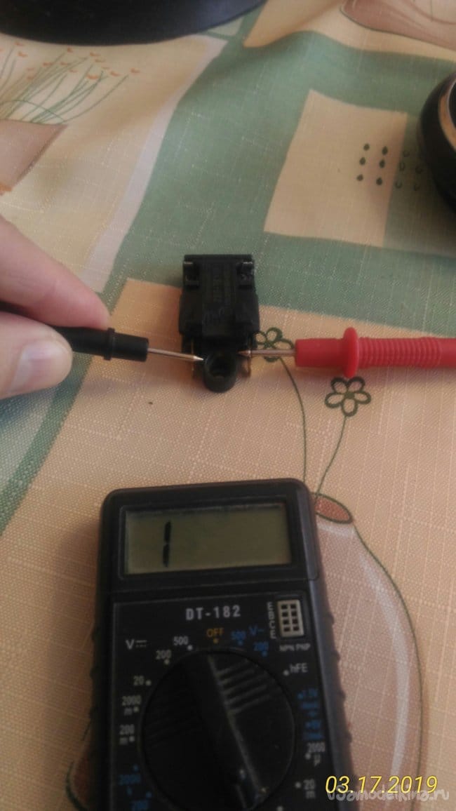 Отсоединяем его от проводов. Прозваниваем тестером. Тестер показывает обрыв.
